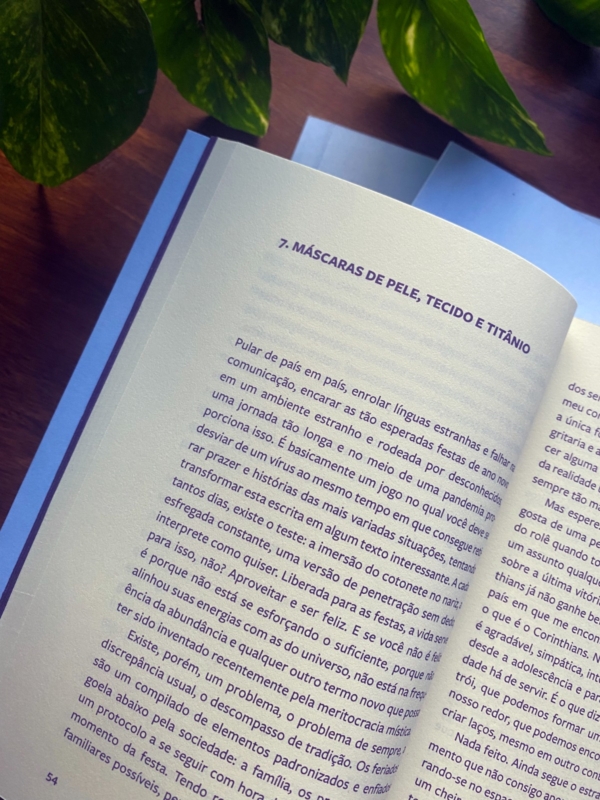 “Máscaras de pele, tecido e titânio” é um romance pandêmico, que começou a ser escrito durante uma viagem pela Europa no meio da explosão da variante Ômicron, com lugares reabertos e refechados, testes, burocracias e a sensação constante de estranheza, de ser um corpo estranho em um lugar estrangeiro, e vice-versa, num mix de ficção científica e relato de viagem semiautobiográfico. Viajando enquanto tenta escrever uma distopia cyberpunk bem convencional e clichê, a escritora se percebe parte de um turismo destrutivo em um continente atrasado, mas que quer posar de símbolo de progresso. Como uma pessoa trans, ela não é uma estranha apenas enquanto atravessa estações de trem desorganizadas, fiordes e ruínas de antes do ano um, mas também é estranha em sua própria cidade e círculo social, carregando essa sensação para a história de ação futurista que é construída no decorrer do livro.